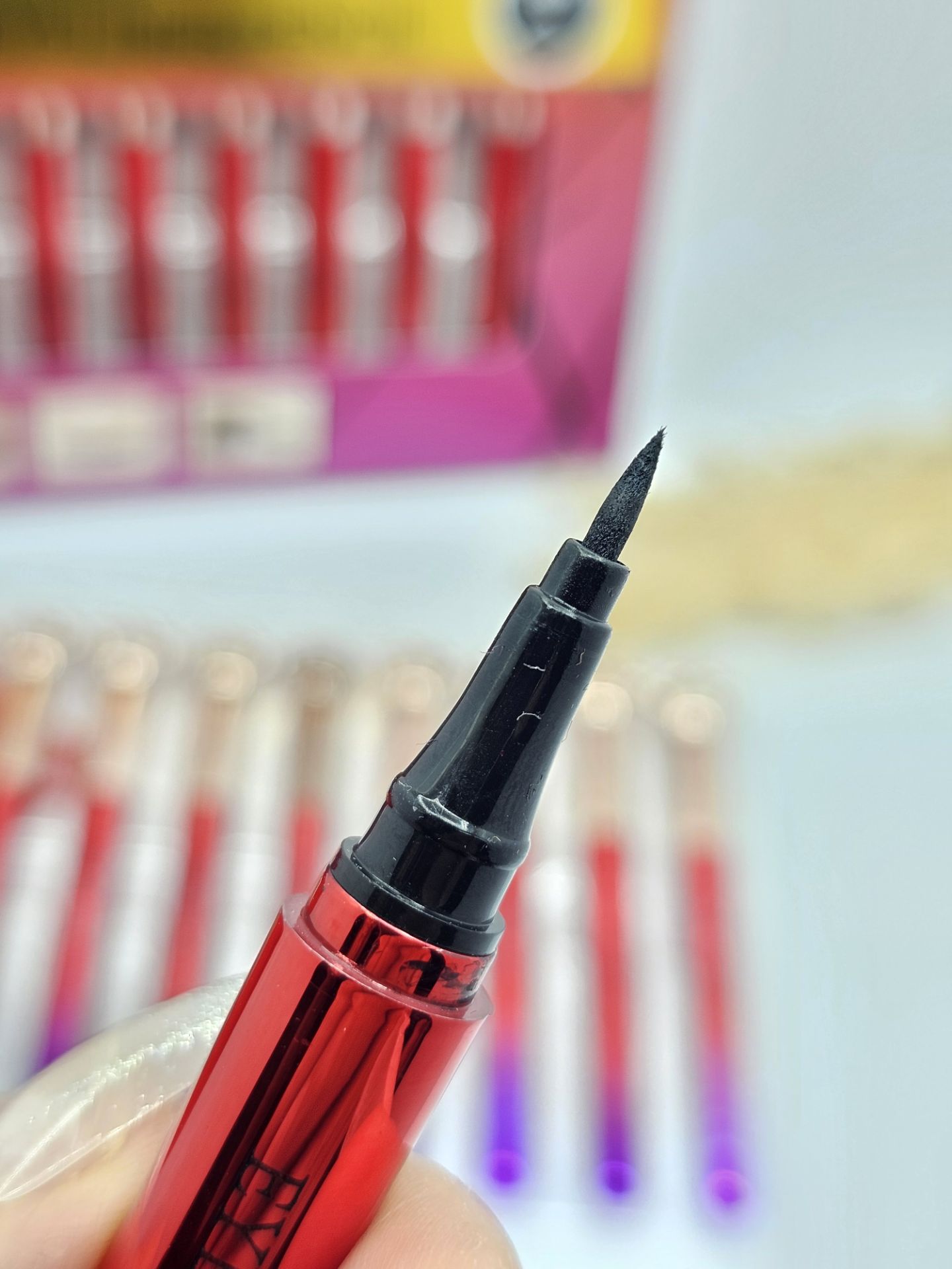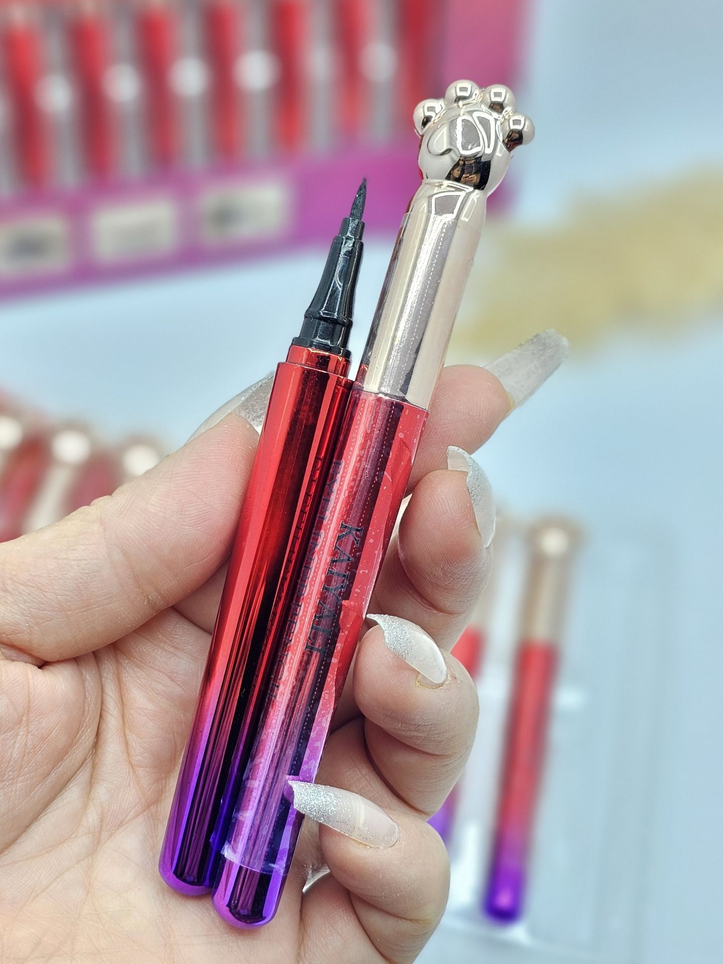 خط چشم ماژیکی کایلی با طراحی پنجه گربه، نوک بسیار باریک برای خط چشم دقیق، ماندگاری 24 ساعته و ضدآب. مناسب برای هدیه با بستهبندی شیک و استندی اختصاصی.